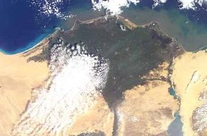 Astronaut Photograph of the Nile Delta, the Wadi Tumilat can be seen on the right (East), just below the main Delta fan (Image courtesy of Earth Sciences and Image Analysis Laboratory, NASA Johnson Space Center, Photo No. ISS006E30447 [http://eol.jsc.nasa.gov]).