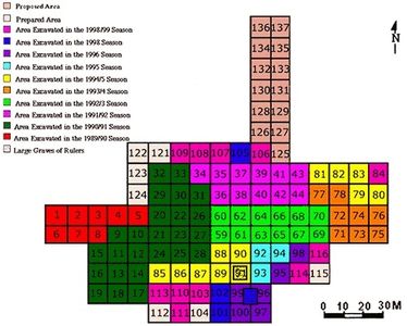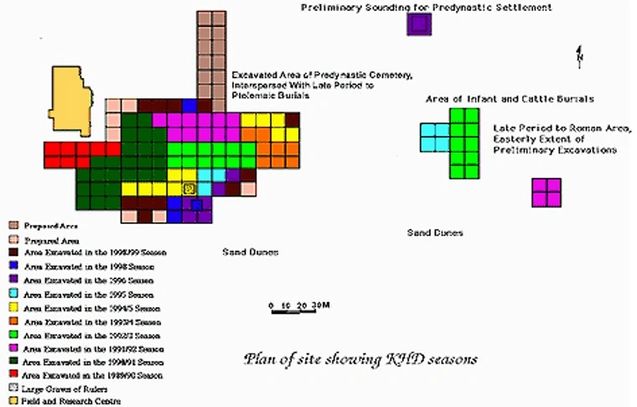 The 1995-1999 seasons resulted in the discovery of 137 Predynastic to Early Dynastic graves, in an excavated area of 117x10m squares that totalled 11,700 square metres. A map of progress in the first five seasons is shown below: