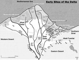 Map of the Nile Delta, c. 3,000 BC showing the settlement patterning of the major Predynastic to Early Dynastic sites (compiled by and copyright [copyright sign] Joris van Wetering, based on initial investigations and analysis of Butzer 2003 and Stanley 2003).
